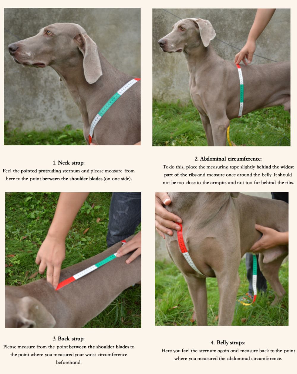 For your tailor-made harness, we need the 4 dimensions of your four-legged friend shown in the photo.